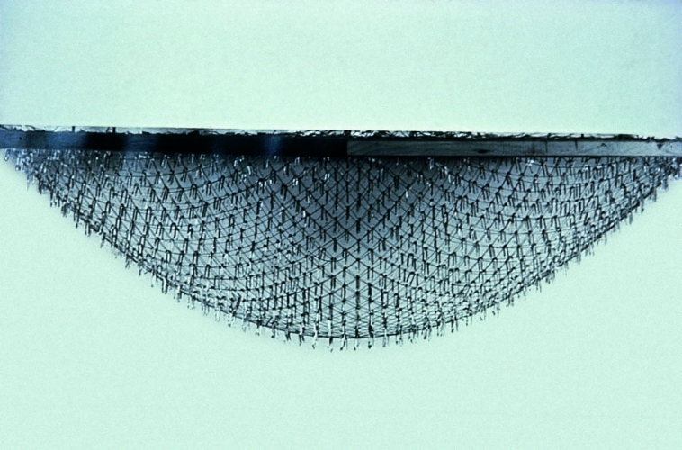 Suspend model composed of textile threads, loaded with u-nails, for the gridshell of the DEUBAU, Essen, Germany 1962