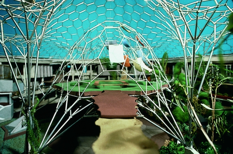 Glance into the model of the six-angle gridshell on branched pillars over the leafy patio of Kings Office, Council of Ministers, Majlis al Shura, Riyadh, Saudi Arabia, 1979 (Rolf Gutbrod, Frei Otto, Büro Happold, Ove Arup and Partner)