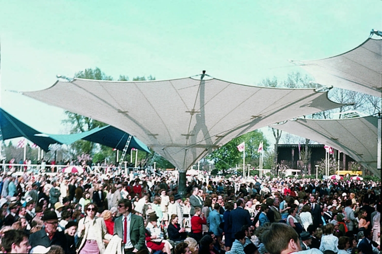 Wandelbare Schirme auf der Bundesgartenschau, Köln 1971 (in Zusammenarbeit mit B. Rasch, H. Isler)