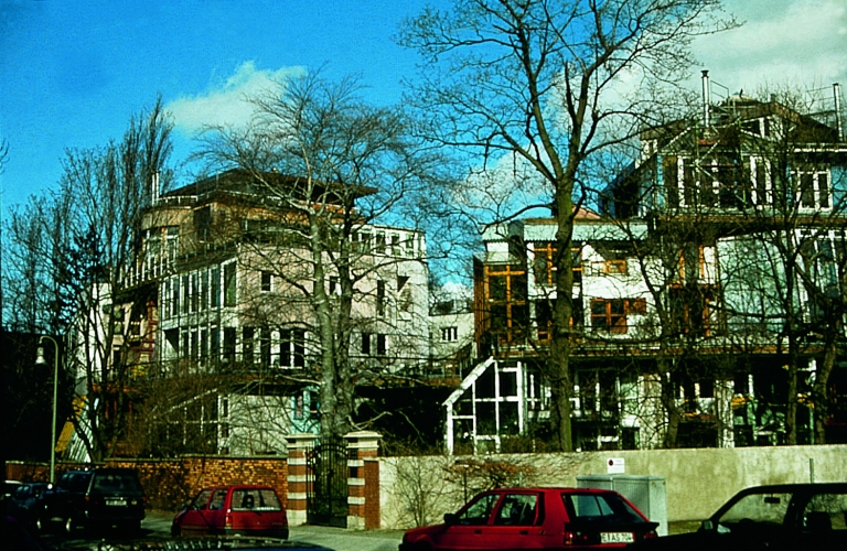 Ecological houses in Berlin, south side of the housegroup, seen from the Landwehrkanal. Berlin, Germany 1982-90 (Concept together with H. Kendel and C. Kanstinger)